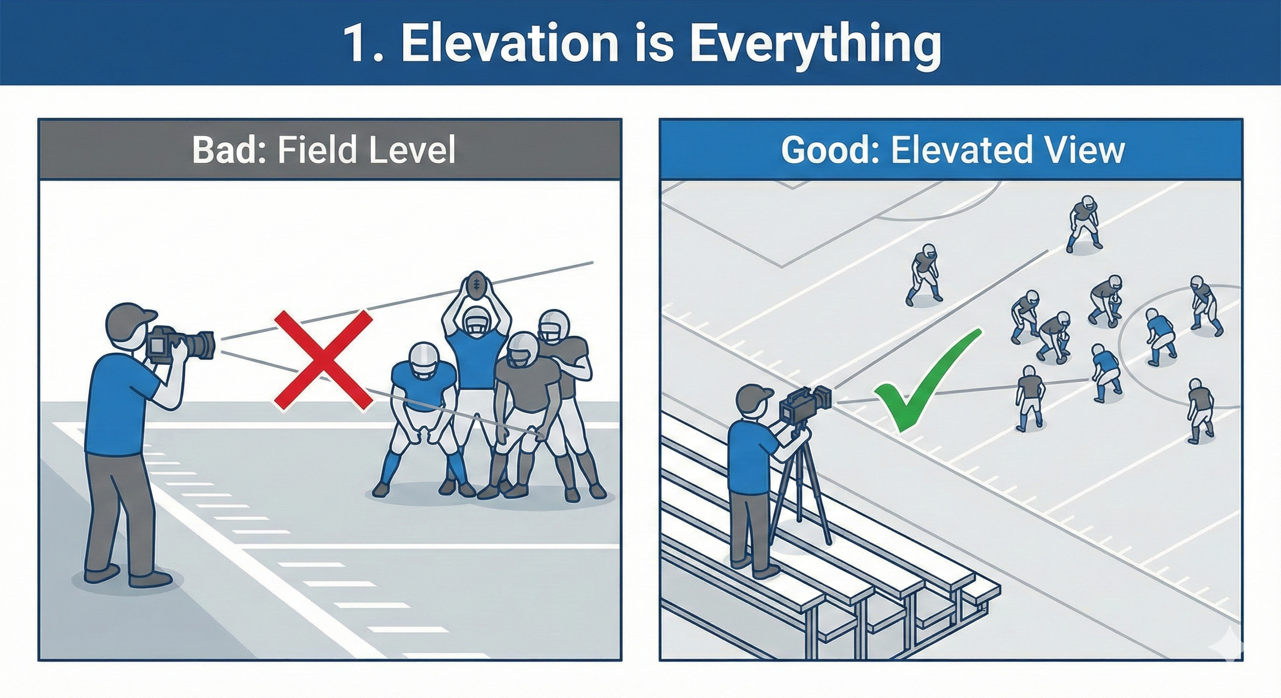 The worst angle to film sports is from the sideline at field level. You cannot see the spacing, the formation, or the passing lanes.
